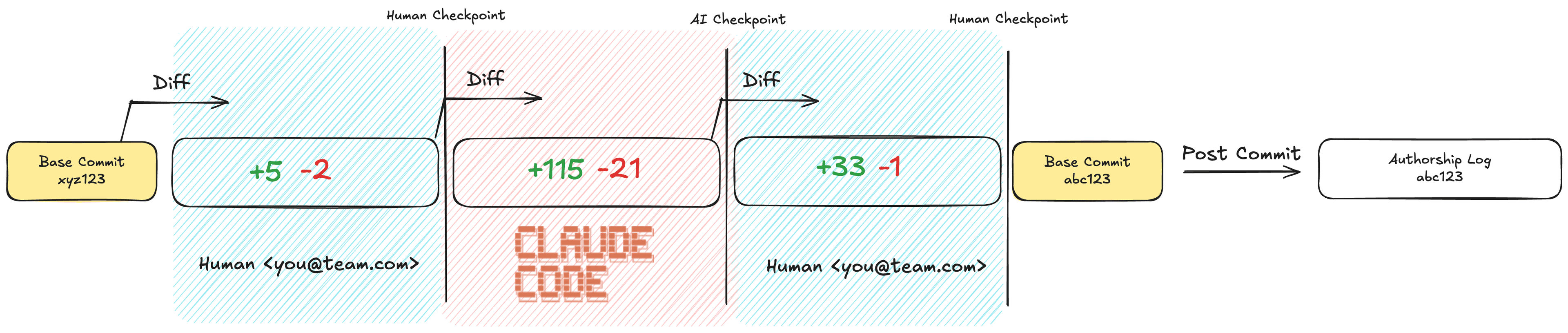 Git AI uses a sequence of local checkpoints to determine who authored each line of code in a commit. Think of each checkpoint as a lightweight snapshot that tracks changes—they're similar to commits but stay entirely on your machine and never enter your Git history.